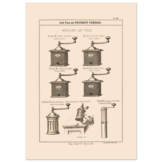 Retour vers les cuisines d'antan avec cette reproduction d'une planche originale du catalogue Les Fils de Peugeot Frères (1885). Cette illustration présente une sélection de moulins en tôle, accessoires pratiques et robustes qui ont marqué les cuisines de nos grands-mères. Ces moulins, avec leurs finitions en laiton et leurs boîtiers en tôle, rappellent les moments chaleureux passés en cuisine.