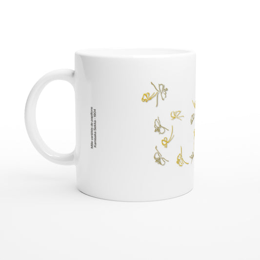 Ce mug minimaliste, tiré de la série Mille variétés de papillons (Chō senshu) 蝶千種, capture une volée de dix-huit petits papillons, une moitié grise et l'autre jaune, aux traits épurés et stylisés. Leurs vols éparpillés créent une impression de mouvement et de liberté, où chaque papillon semble flotter avec légèreté. Une pièce qui allie simplicité et élégance, idéale pour les amateurs de design épuré et de poésie visuelle.