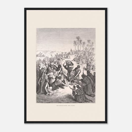 Cette estampe incarne le talent de Doré pour les scènes de partage et de compassion, où chaque élément renforce la dimension miraculeuse et humaine. La référence biblique, Saint Matthieu XV, 32, évoque la générosité et la providence.