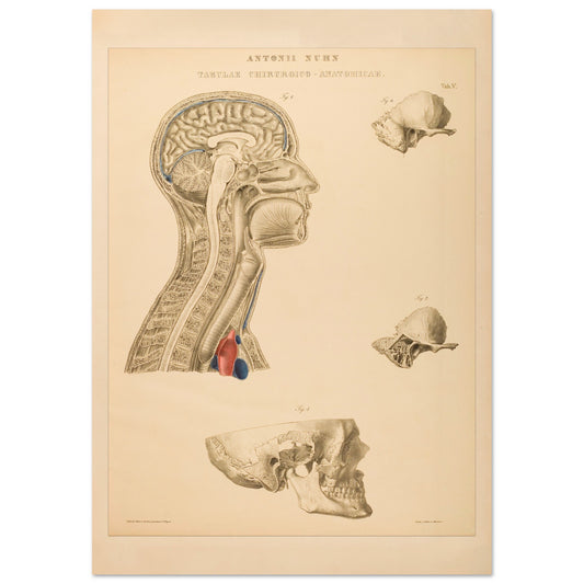 Cette superbe reproduction d'une planche anatomique issue du recueil Planches chirurgicales et anatomiques (Chirurgisch-anatomische Tafeln) par l'anatomiste allemand Anton Nuhn (1814 - 1889) et publié en 1846, présente une vue complète et détaillée des structures internes du crâne, du cou et de la partie supérieure de la poitrine. La planche offre une représentation précise des éléments essentiels, y compris le gros et le petit cerveau, le tronc cérébral, ainsi que les principales cavités, telles que la cavité nasale, la cavité buccale, et la cavité du pharynx, qui comprend les trompes d'Eustache.