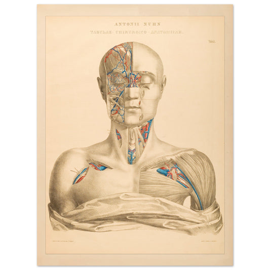 Cette reproduction fidèle d'une planche anatomique issue du recueil Planches chirurgicales et anatomiques (Chirurgisch-anatomische Tafeln) par l'anatomiste allemand Anton Nuhn (1814 - 1889) et publié en 1846, présente une représentation d’une grande précision des régions de la tête, du cou et de la partie supérieure de la poitrine. Réalisée dans un souci de rigueur scientifique, cette planche met en avant des éléments essentiels pour la chirurgie de l’époque, en illustrant avec soin les structures anatomiques dans leur position naturelle. Les détails y sont minutieux : le crâne, les muscles faciaux, ainsi que les réseaux complexes de veines, d’artères et de nerfs sont clairement visibles, offrant une vision complète des éléments qui composent ces régions du corps.
