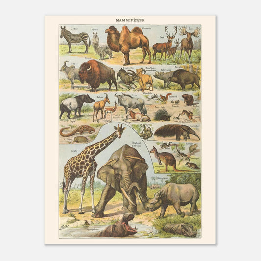 Cette superbe planche encyclopédique, tirée de l’Encyclopédie Larousse pour tous de 1910, met à l’honneur les grands mammifères terrestres : éléphant, girafe, chameau et bison s’y côtoient dans une composition équilibrée et pleine de majesté. Cette reproduction d’art restitue fidèlement la richesse graphique et le souci du détail des planches naturalistes d’origine.