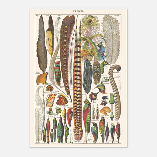 Découvrez cette planche ancienne consacrée aux plumes, tirée de l’Encyclopédie Larousse pour tous publiée en 1910. Elle illustre une variété de plumes issues de différentes espèces d’oiseaux, telles que plumes de corbeau, d’autruche, de faisan et de canard, utilisées autrefois pour l’écriture ou la décoration, et reproduites avec un soin minutieux et un rendu naturaliste exceptionnel. Les détails des barbes et des couleurs mettent en valeur la diversité et la finesse de ces éléments naturels.