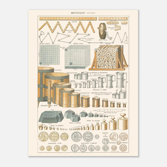 Explorez cette planche ancienne consacrée au système métrique, tirée de l’Encyclopédie Larousse pour tous publiée en 1910. Elle présente une sélection d’unités et d’instruments de mesure emblématiques du début du XXᵉ siècle, tels que mètres d’arpenteur à ruban, ainsi que diverses mesures de volumes en bois, en fer blanc ou en étain, et de poids en fonte ou en cuivre. La planche se clôt sur les représentations des monnaies d’époque — or, argent, nickel et bronze — soigneusement illustrées.