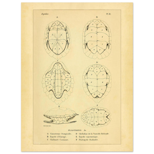 Cette reproduction présente une planche scientifique détaillée des plastrons de différents chéloniens, tels que le Cinosterne scorpioïde, l'Emyde caspienne, la Chélonée caouane, la Chélodine de la Nouvelle-Hollande, l'Emyde à lignes concentriques et la Platémyde radiolée. Elle met en évidence la variété dans le nombre et la disposition des plaques osseuses, offrant un aperçu anatomique précis.