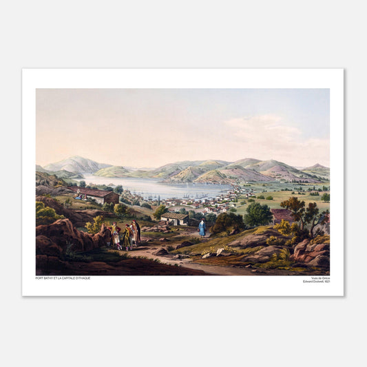 Port Bathy et la capitale d'Ithaque est une illustration issue du recueil Views in Greece from Drawings publié par Edward Dodwell en 1821.