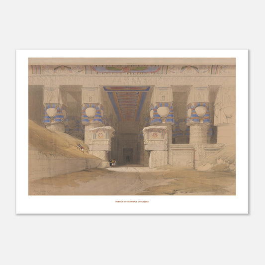 Le "Portique du Temple de Dendara" est un exemple impressionnant des temples égyptiens de la période romaine, situé sur la plaine occidentale de la vallée du Nil, à environ deux miles du fleuve. Ce portique est remarquable pour son état de conservation exceptionnel : les sculptures et les peintures sont encore très nettes, bien que les figures de la déesse Hat Hor aient été endommagées, probablement par les iconoclastes chrétiens. Les colonnes du portique sont ornées de détails riches, mais le style, bien que grandiose, est plus lourd et moins raffiné que les œuvres antérieures.