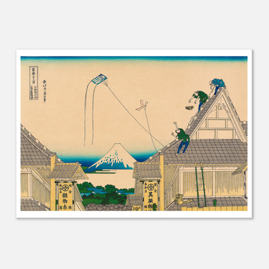 Poster d'art japonais illustrant la beauté paisible et raffinée de la nature japonaise - Un croquis des magasins Mitsui par Katsushika Hokusai