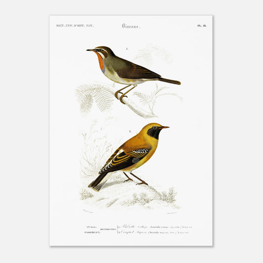 Reproduction gravure de : Rubiette Calliope (Lusciola Calliope, Key. et Blas.), Traquet stapazin (Saxicola stapazina, Temm.)