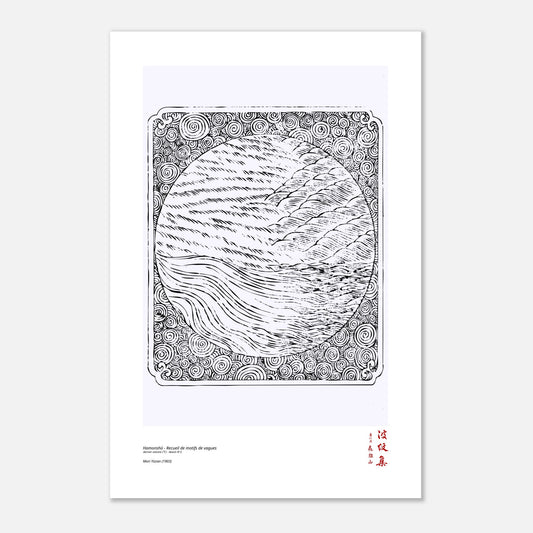 Plongez dans l’élégance intemporelle de l’art japonais avec cette reproduction du motif N°2 extraite du dernier volume (下) du Hamonshū, un recueil emblématique réalisé en 1903 par Mori Yūzan. Le titre original (波紋集), signifiant littéralement « Recueil de motifs de vagues », cette collection met en lumière un thème universel : le mouvement fluide et harmonieux de l’eau et des formes qui l’évoquent. Conçu pour guider les artisans dans l’ornementation de leurs créations, Hamonshū regroupe des motifs variés, allant d’ondulations abstraites à des compositions plus figuratives, parfois proches du paysage, toujours empreintes de poésie et d’une maîtrise esthétique exceptionnelle.