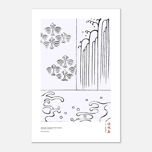 Plongez dans l’élégance intemporelle de l’art japonais avec cette reproduction du motif N°42 extraite du dernier volume (下) du Hamonshū, un recueil emblématique réalisé en 1903 par Mori Yūzan. Le titre original (波紋集), signifiant littéralement « Recueil de motifs de vagues », cette collection met en lumière un thème universel : le mouvement fluide et harmonieux de l’eau et des formes qui l’évoquent. Conçu pour guider les artisans dans l’ornementation de leurs créations, Hamonshū regroupe des motifs variés, allant d’ondulations abstraites à des compositions plus figuratives, parfois proches du paysage, toujours empreintes de poésie et d’une maîtrise esthétique exceptionnelle.