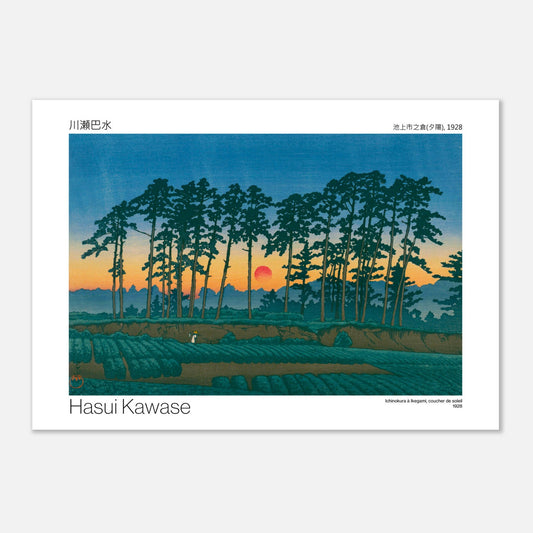 Poster scène japonaise célébrant la relation harmonieuse avec la nature au japon - Ichinokura à Ikegami, coucher de soleil par Hasui Kawase