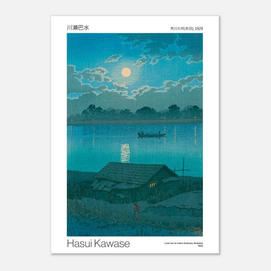Poster Shin-hanga évoquant la poésie silencieuse des temples et sanctuaires - Lune sur la rivière Arakawa, Akabane par Hasui Kawase