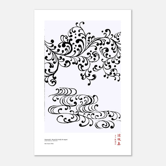 Plongez dans l’élégance intemporelle de l’art japonais avec cette reproduction du motif N°20 extraite du premier volume (上) du Hamonshū, un recueil emblématique réalisé en 1903 par Mori Yūzan. Le titre original (波紋集), signifiant littéralement « Recueil de motifs de vagues », cette collection met en lumière un thème universel : le mouvement fluide et harmonieux de l’eau et des formes qui l’évoquent. Conçu pour guider les artisans dans l’ornementation de leurs créations, Hamonshū regroupe des motifs variés, allant d’ondulations abstraites à des compositions plus figuratives, parfois proches du paysage, toujours empreintes de poésie et d’une maîtrise esthétique exceptionnelle.