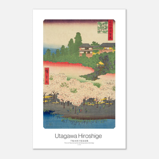 Reproduction d'estampe Rendant hommage à l'éphémérité de la nature japonaise - Parc en fleurs et pente de Dangozaka à Sendagi de Hiroshige