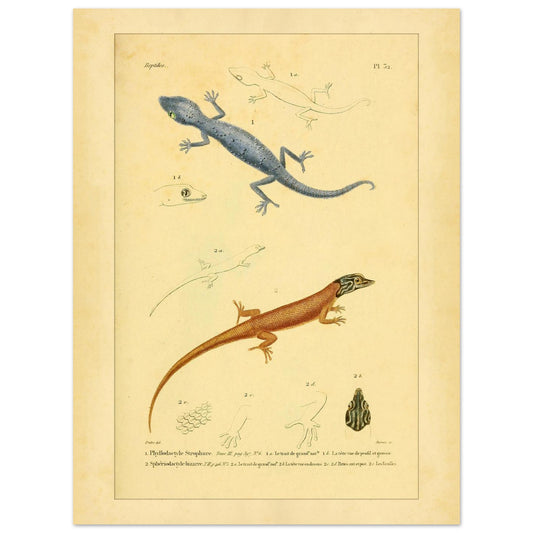 Cette reproduction présente deux espèces de lézards : le Phyllodactyle strophure et le Sphériodactyle bizarre. La planche détaille ces reptiles, y compris des vues agrandies de leurs têtes et des pattes, offrant un examen scientifique approfondi. Les figures sont accompagnées de légendes précises pour identifier chaque élément.