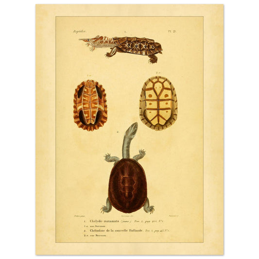 Cette reproduction de planche scientifique présente deux espèces de tortues aquatiques : la Chélyde matamata (1) et la Chélodine de la Nouvelle-Hollande (2). La gravure offre des vues de dessus et de dessous des carapaces, ainsi que des études détaillées de la tête de chaque spécimen, mettant en lumière leurs particularités morphologiques.