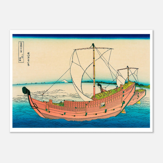 Dans cette estampe des Trente-six vues du mont Fuji, Hokusai montre une fois de plus sa capacité à capturer l’immensité des paysages japonais, tout en mettant en valeur les détails minutieux des voiliers et des vagues.