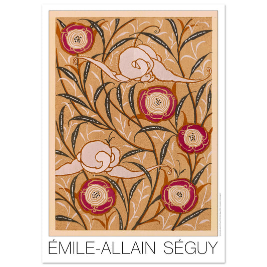 Cette composition florale se distingue par son raffinement et sa subtilité chromatique. Sur un fond sable aux nuances douces, de grandes fleurs en spirale s’épanouissent dans un délicat mélange de beige, de crème et de rouge profond. Les tiges ondoyantes et feuillages stylisés parcourent la composition avec une légèreté qui rappelle les ornements végétaux des enluminures persanes ou des textiles traditionnels d’Asie centrale. Le travail de Séguy sur cette planche illustre parfaitement son talent pour l’équilibre des formes et la fluidité du dessin. L’harmonie des couleurs, alternant entre tons chauds et accents sombres, confère à l’ensemble une élégance intemporelle. L’influence de l’Art Déco transparaît dans la simplification des motifs et le jeu subtil sur les contrastes, rendant ce design à la fois sophistiqué et accessible. Cette reproduction est idéale pour une décoration raffinée et apaisante, où le motif floral apporte une touche de douceur et de sophistication. Parfait pour sublimer un intérieur inspiré des arts décoratifs du début du XXe siècle, ce motif témoigne du génie d’Émile-Allain Séguy, qui a su capter l’essence du style oriental tout en l’inscrivant dans une modernité éclatante.