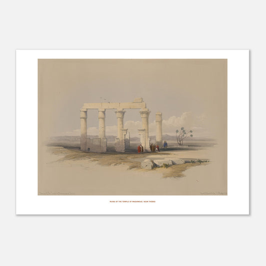 Les élégants chapiteaux, ornés de lotus épanouis et en bourgeon, offrent un contraste architectural fascinant et ajoutent une touche de beauté unique à ces ruines. Bien que le temple soit aujourd’hui entouré des vestiges d’une ville ancienne et de maisons en briques crues, il reste un témoignage précieux de l'évolution architecturale égyptienne. Cette gravure est idéale pour les passionnés d'archéologie et d'histoire antique, apportant une note élégante et historique à tout espace.