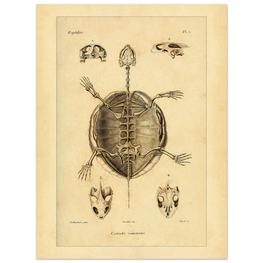 Issue de l'ouvrage majeur « Erpétologie générale ou Histoire naturelle complète des reptiles » de Duméril (1834-1840), cette illustration scientifique illustre la rigueur des études anatomiques de l'époque. Elle appartenait à la section des Chéloniens et mettait en avant la structure osseuse des tortues.
