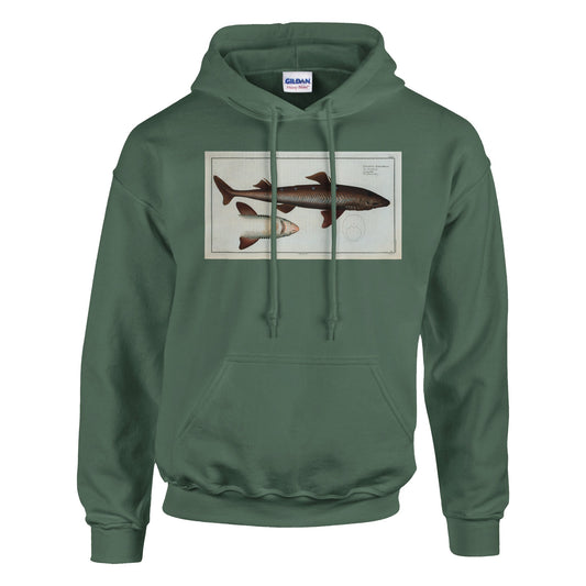Sweat shirt illustré d'une reproduction d'une planche naturaliste issue de l'ouvrage Ichtyologie, ou, Histoire naturelle, générale et particulière des poissons : avec des figures enluminées, dessinées d'après nature par Marcus Elieser Bloch (1723-1799) et publié entre 1785 et 1797.