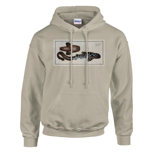 Sweat shirt illustré d'une reproduction d'une planche naturaliste issue de l'ouvrage Ichtyologie, ou, Histoire naturelle, générale et particulière des poissons : avec des figures enluminées, dessinées d'après nature par Marcus Elieser Bloch (1723-1799) et publié entre 1785 et 1797.