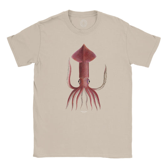 Ce t-shirt met à l'honneur une superbe illustration naturaliste d’un calamar Todare (Loligo Todarus), extraite d’un ancien recueil d’histoire naturelle. Avec son allure élancée et ses tentacules finement détaillés, ce céphalopode emblématique des océans profonds apporte une touche d’élégance scientifique à votre tenue.