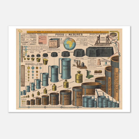 Cette reproduction d'une affiche pédagogique de 1929 est un véritable témoignage de l'éducation d'autrefois, représentant les systèmes de poids et mesures tels qu'ils étaient enseignés dans les écoles. Créée pour sensibiliser les élèves aux différentes unités de mesure, l'affiche détaille de manière claire et visuelle des concepts essentiels comme le mètre, le litre, le kilogramme et leurs multiples. Elle illustre également les correspondances entre les différentes unités, avec des illustrations précises d'instruments de mesure, tels que des poids en fonte, des litres et des stères pour mesurer le bois.