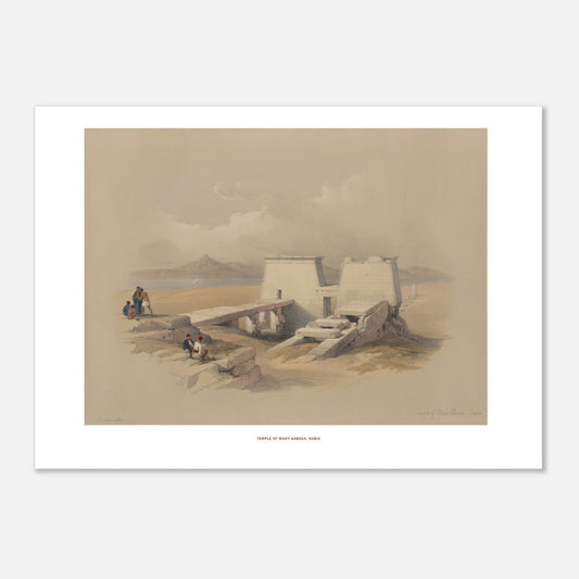 Reproduction d'une gravure d'un dessin de David Roberts (1796-1864) réalisé durant son périple de trois mois qui l’a conduit d’Alexandrie au temple d’Abou Simbel en Nubie, soit un voyage de plus de quinze cents kilomètres.