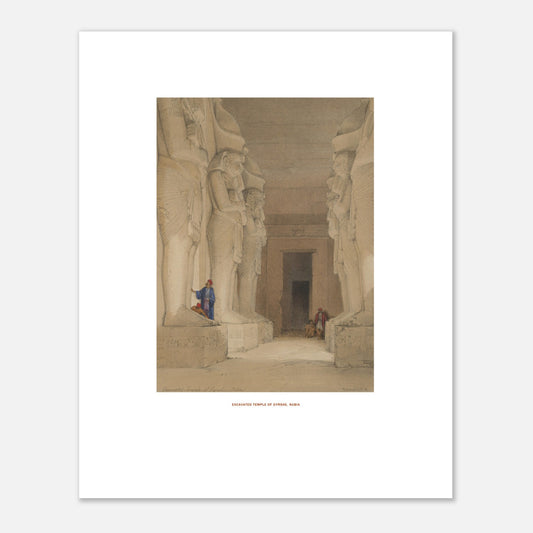 Reproduction d'une gravure d'un dessin de David Roberts (1796-1864) réalisé durant son périple de trois mois qui l’a conduit d’Alexandrie au temple d’Abou Simbel en Nubie, soit un voyage de plus de quinze cents kilomètres.