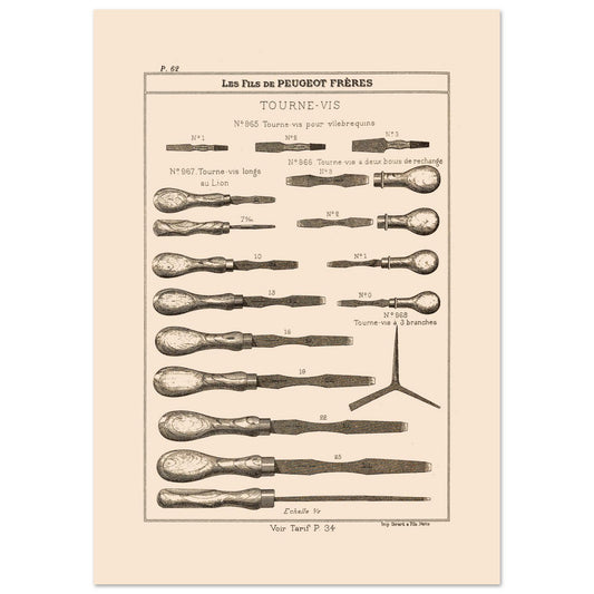 Retrouvez le charme des outils d'antan avec cette reproduction d'une planche originale du catalogue Les Fils de Peugeot Frères (1885). Cette illustration présente une sélection de tourne-vis, outils indispensables dans chaque foyer depuis le XIXe siècle. Ces modèles, avec leurs manches en bois sculpté et leurs lames en acier forgé, rappellent le savoir-faire artisanal d'une époque où chaque détail comptait.