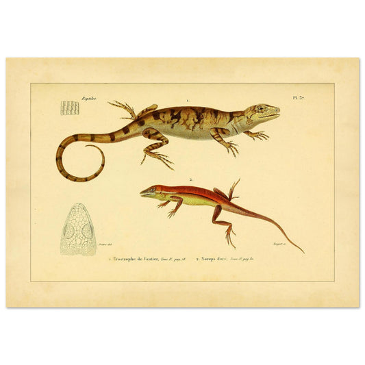 Cette reproduction s'adresse aux passionnés de lézards, aux étudiants en zoologie et aux collectionneurs d'illustrations scientifiques. Elle constitue un élément décoratif à la fois éducatif et esthétique pour un bureau ou une pièce d'étude.