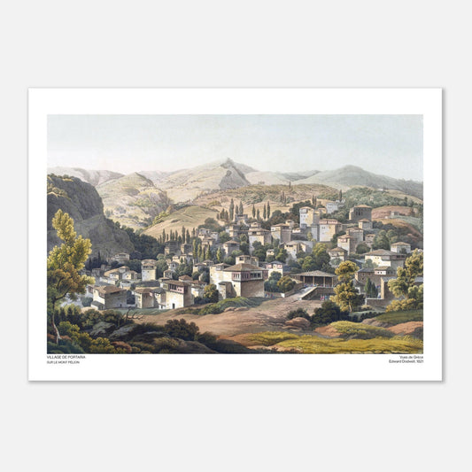 Village de Portaria, sur le mont Pélion est une illustration issue du recueil Views in Greece from Drawings publié par Edward Dodwell en 1821.