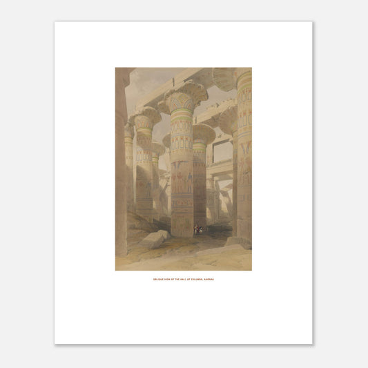 La gravure met en lumière les colonnes principales ornées de capitaux en forme de lotus, ainsi que les colonnes plus courtes disposées sur les côtés, créant un jeu d'ombre et de lumière fascinant dans cette vaste salle. Avec ses rangées de colonnes et ses éléments architecturaux en ruine, cette vue oblique permet d'apprécier la magnificence du temple et l'ampleur de son design complexe. Cette œuvre est idéale pour les passionnés d'histoire ancienne et d'architecture, offrant un aperçu précieux des monuments égyptiens antiques et apportant une touche d'élégance et de grandeur à tout intérieur.